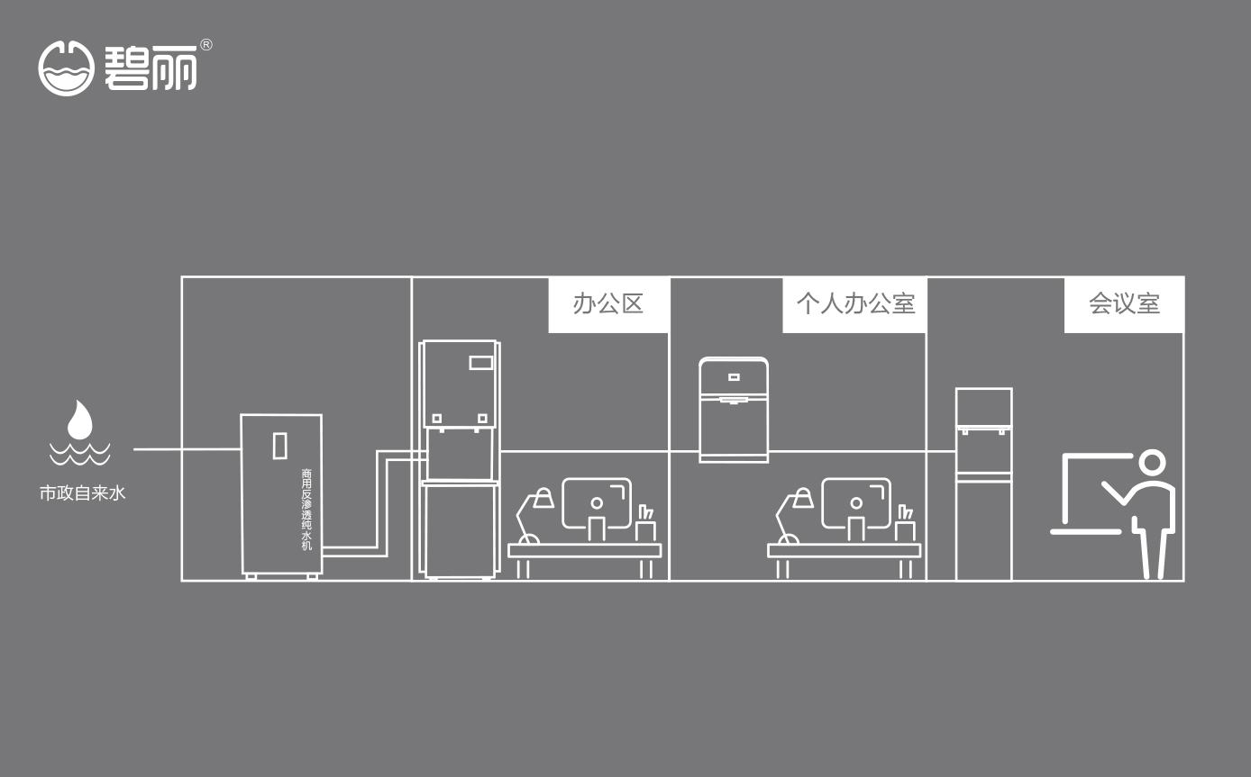碧麗租賃商用反滲透純水機(jī)將自來水集中處理后,把優(yōu)質(zhì)的純凈水通過專用的供水管道輸送到各飲水點(diǎn);